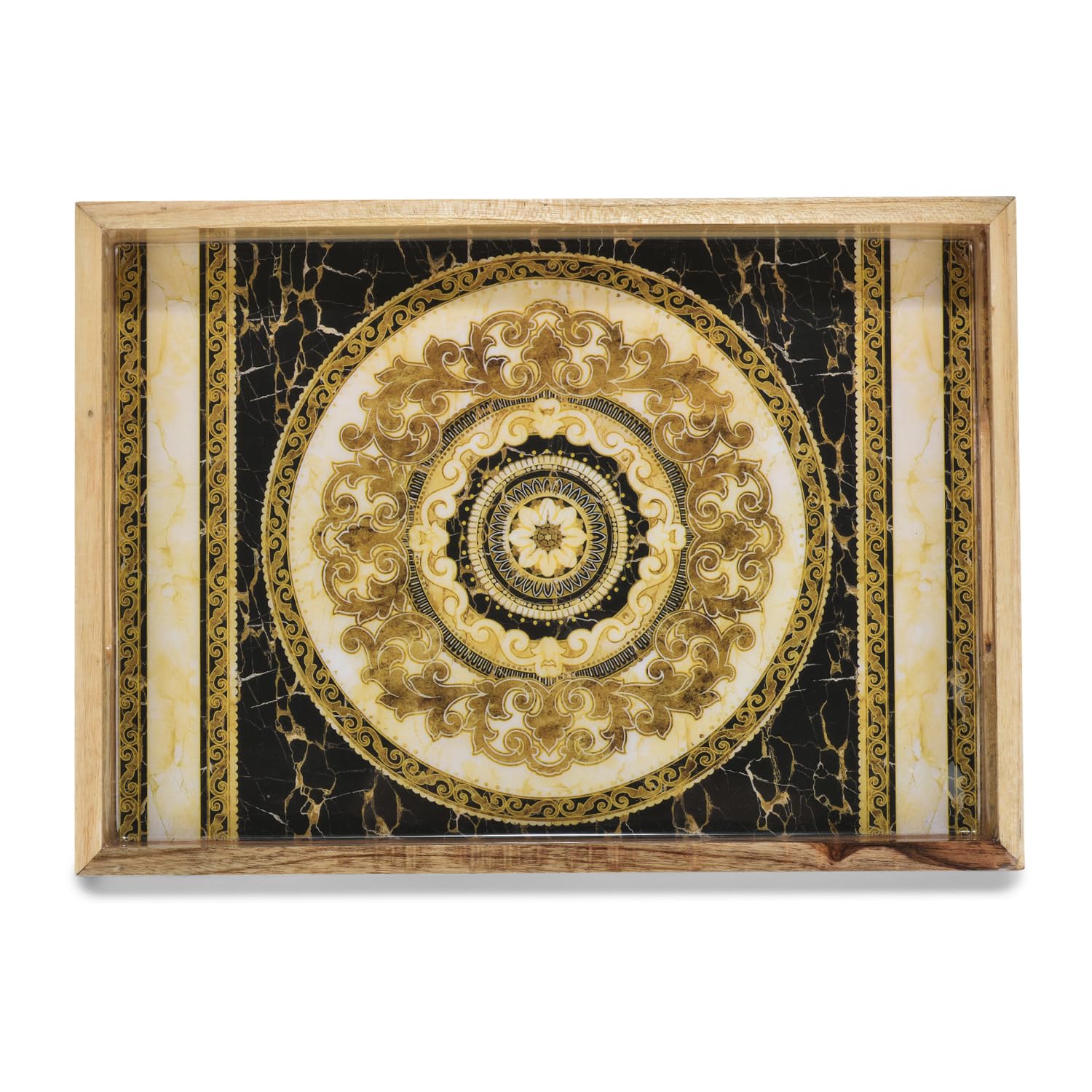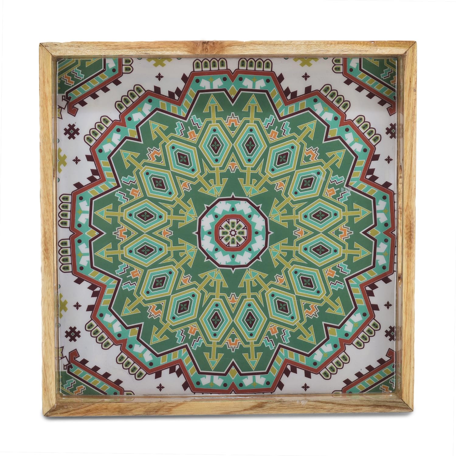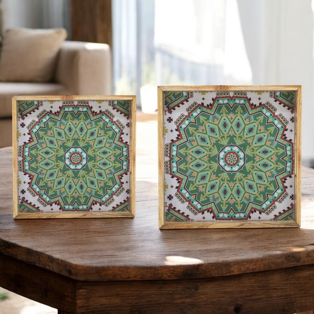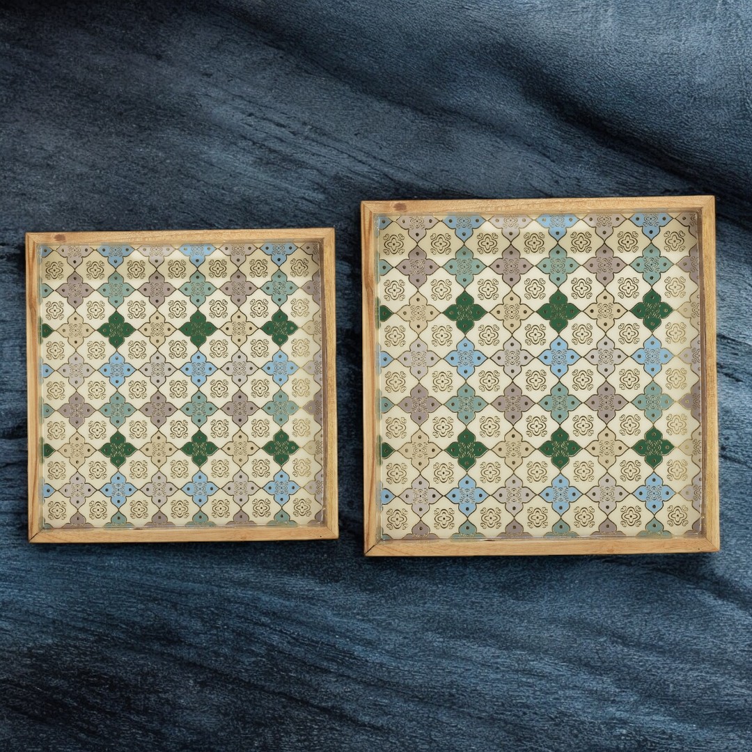 Set of 2 Teak Wood Rectangular Printed Trays for Snacks | Serving Tray for Home & Dining Table | Multipurpose Decorative Serving Tray (Multi square)